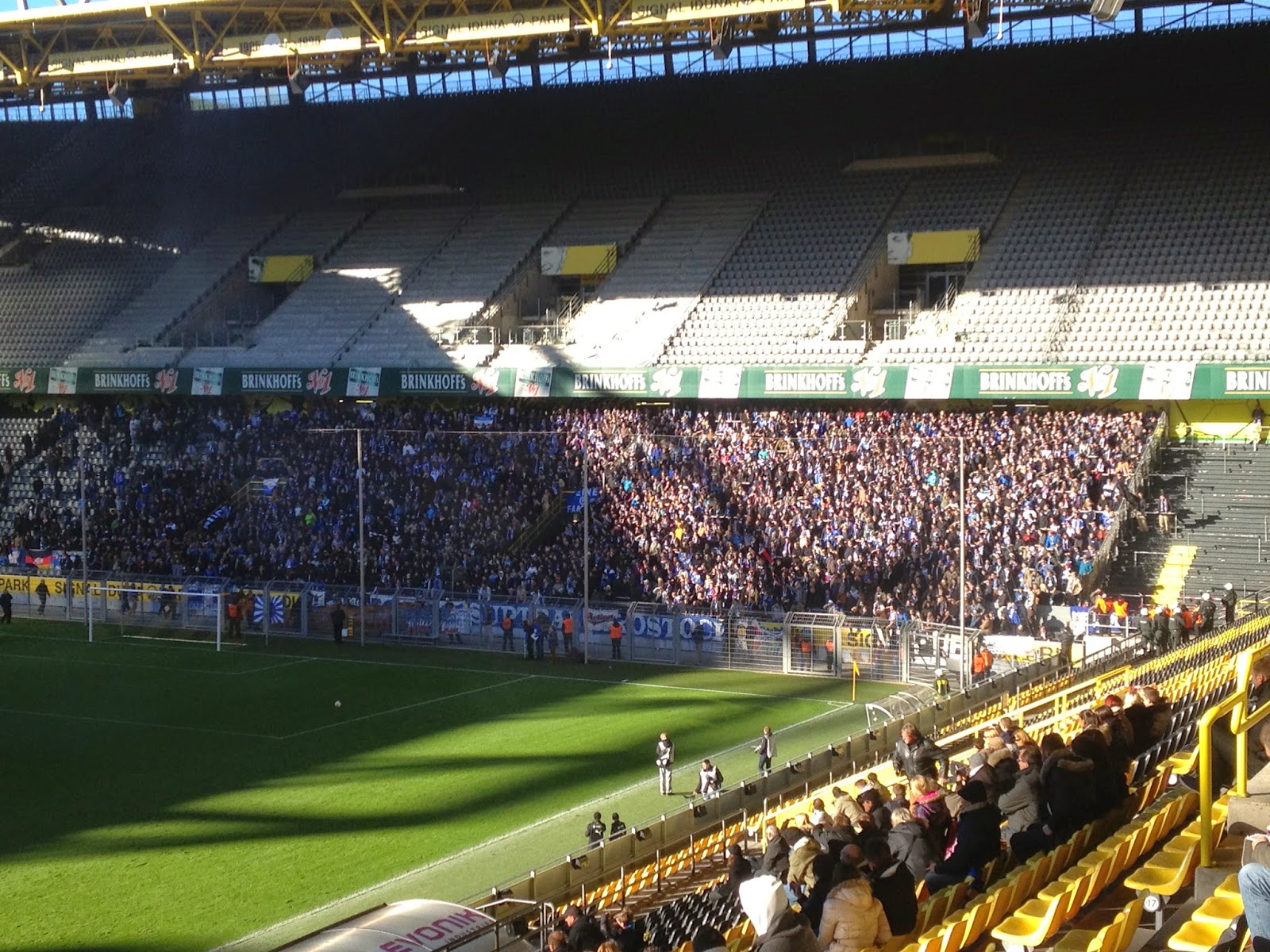Das Stadion... Der absolute Gegensatz zur vorher besuchten Arena vom LOSC! Das Stade Robert urbain kann also wirklich absolut gefallen! Drei Seiten sind mit Tribünen ausgebaut, wovon der Gästeblock Stehplätze überdacht bietet, eine kleine Sitztribüne die Gegenseite zeirt und der Hingucker ist sicherlich die "Tribune d´Honneur"! Unten Stehplätze, oben Sitzplätze und wenn der Wind nicht mit rasender Geschwindigkeit regen in die Richtung schießt, bleiben auch hier auf fast allen Plätzen alle besucher trocken. Die zweite Hintertorseite, gegenüber vom Gästeblock, besitzt zwar keine Tribüne, aber dafür ist hier das nicht so belgientypische Clubheim mit Blick aufs Spielfeld erbaut worden.
